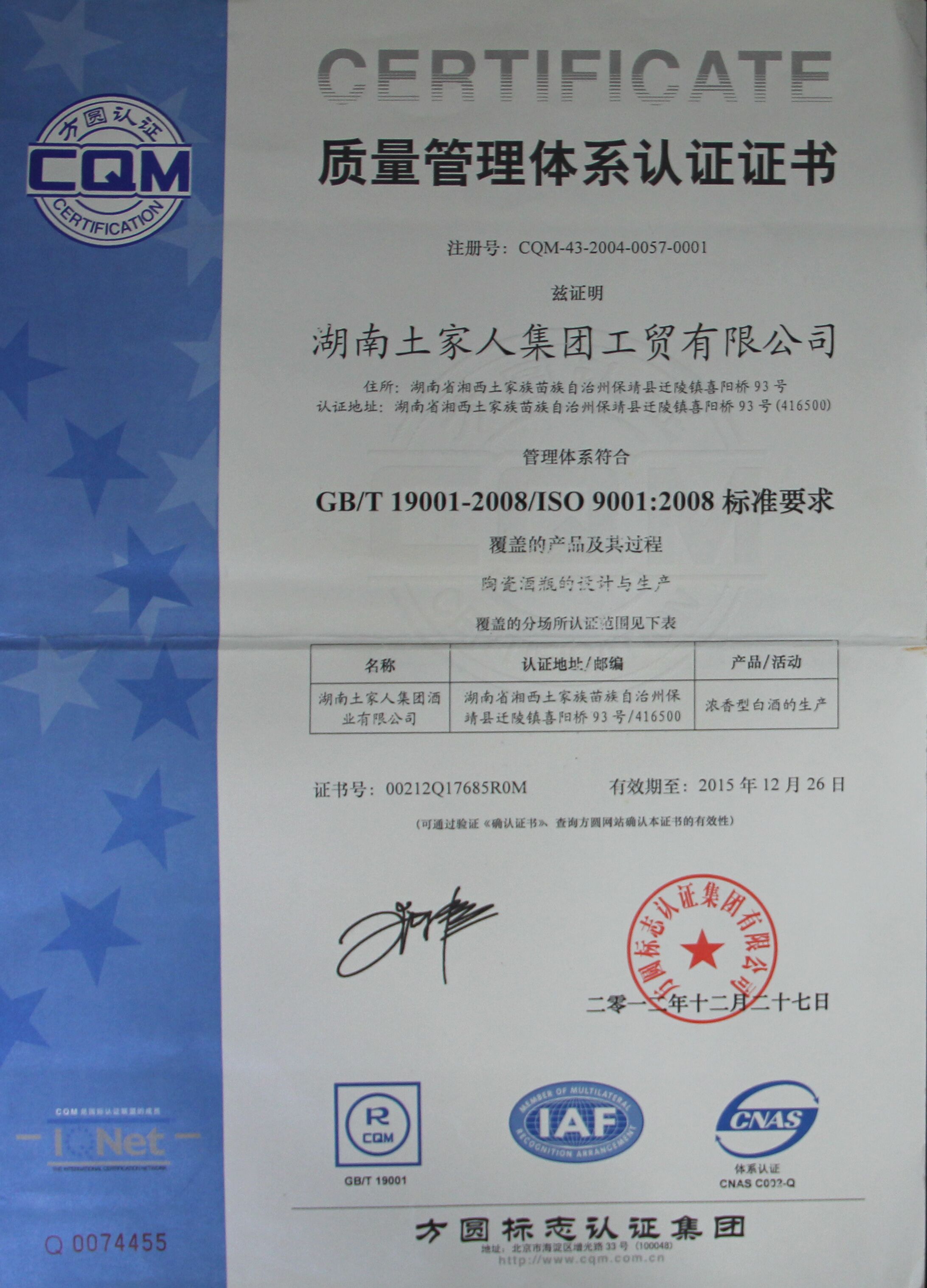 质量管理体系认证证书